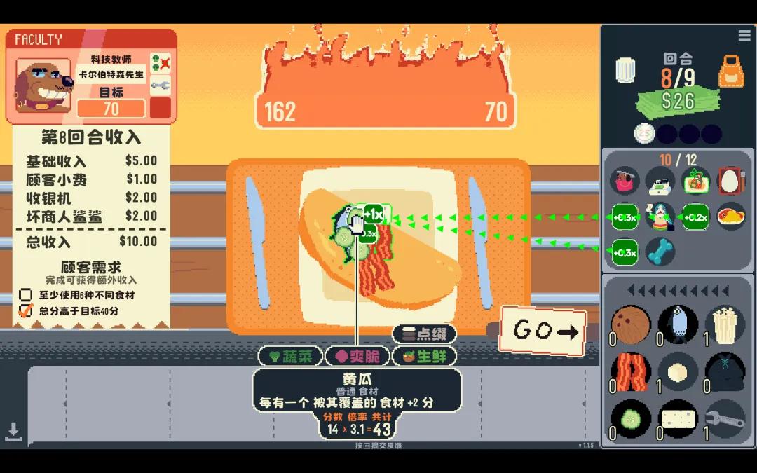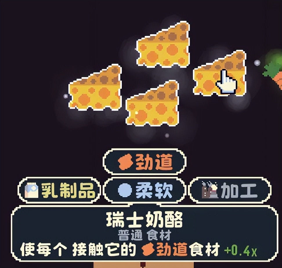 比如特定的食材标签会带来相应的构筑:根茎类食材能够赚取更多的金钱,进而在商店环节拥有更多的主动权;奶酪食材通常能够给接触的食材倍乘结算分数,比累加带来的数字更大。