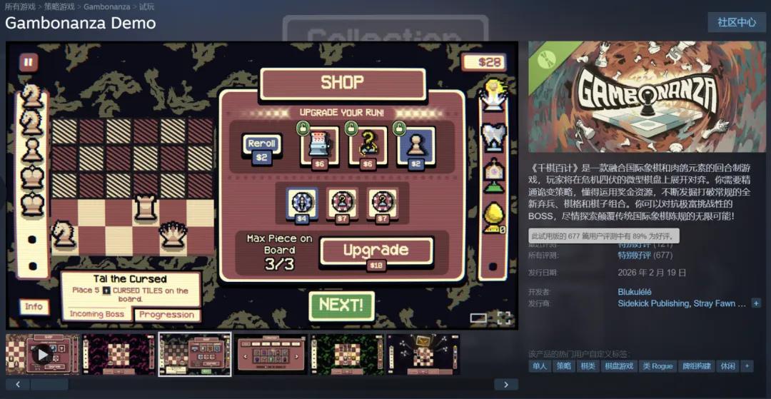 150余种Gambit对标小丑牌的Joker,比如用兵吃子后对方跳过一回合,或者升变的兵直接变成国王。和前面几款产品不同的是,Gambonanza的棋盘对面有一个AI在走棋。你的构筑不只是为了冲分,还要应对对手的反应,策略空间多了一个博弈维度。