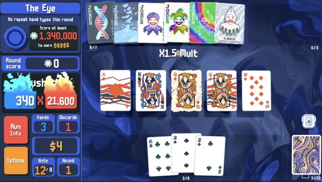 2024年2月,加拿大独立开发者LocalThunk发布了《小丑牌》(Balatro),全平台销量在一年内突破500万套,拿下TGA 2024最佳独立游戏。它用扑克——一个全世界几乎人人都懂的规则系统——作为核心玩法,再通过一整套肉鸽构筑体系(Joker、塔罗牌、星球牌)让玩家逐步扭曲这套规则本身,直到一手普通的对子也能打出百万分。