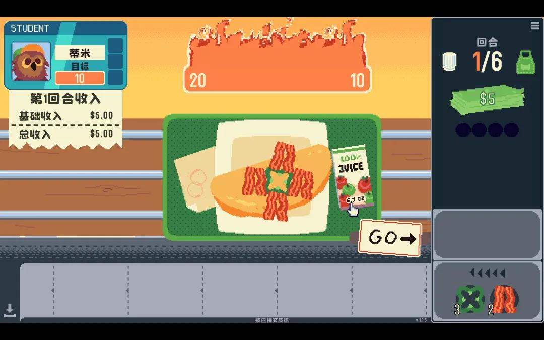 食材从传送带上滚过来,你挑一个放进煎蛋卷,靠食材之间的搭配打出尽可能高的分数。每过一关,你用赚到的钱在商店里买新食材和增益道具,然后迎接下一个更难伺候的客人。