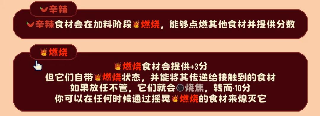 「辛辣」食材会让周围的食物燃烧,最初会带来加分,放任不管就会烧成焦炭。