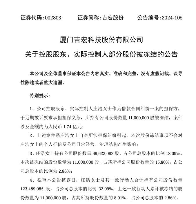 事件四:吉宏股份:实际控制人庄浩1100万股股份被冻结