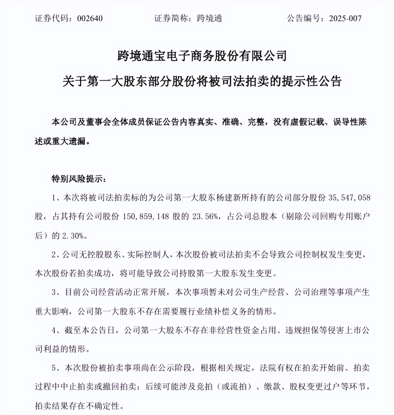 2月26日消息,跨境通发布公告,公司近日通过网络查询获悉,公司第一大股东杨建新所持公司股份3554.71万股(占总股本2.30%)将被贵州省贵阳市中级人民法院于2025年3月20日10时至2025年3月21日10时止(延时除外)在淘宝司法拍卖网络平台上进行公开拍卖。