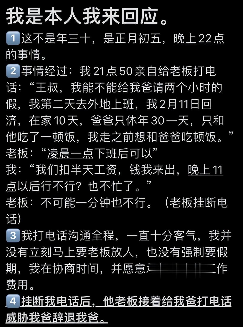 为了能在离家前和父亲吃顿团圆饭,女子打电话求情父亲老板能给两个小时短假,谁成想竟遭到了老板的威胁。
