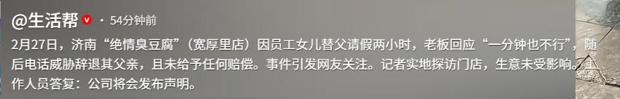 可没想到的是,女子的话刚说完就遭到老板的怒怼,不仅拒绝了提议,还威胁女子父亲说,敢请假就开除。
