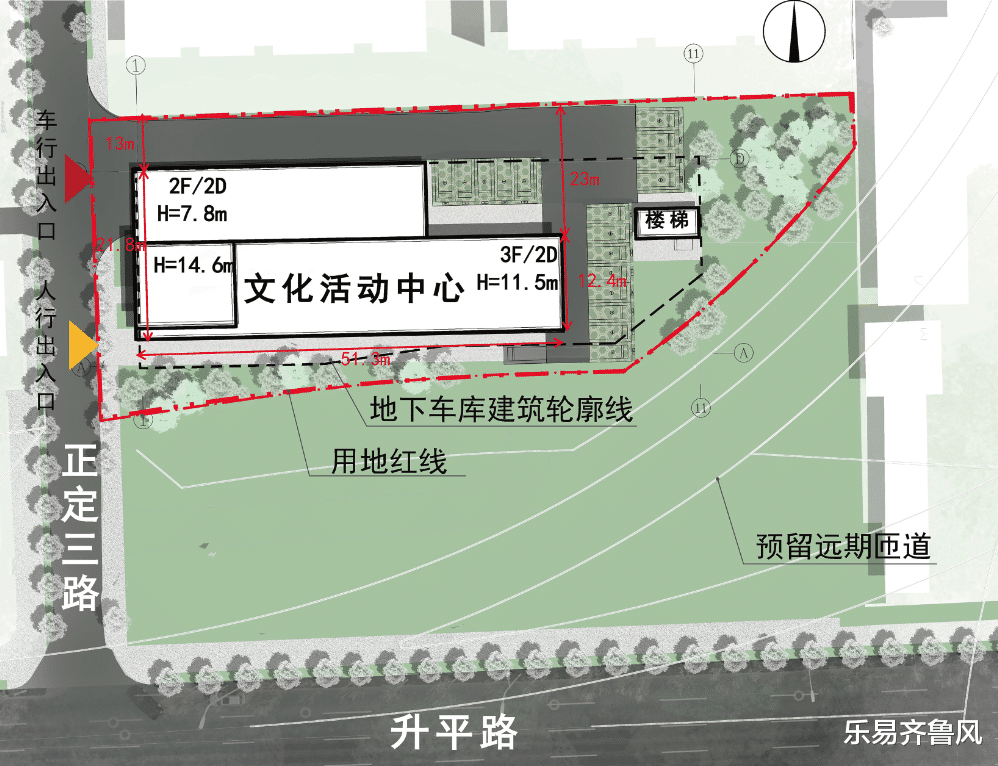 为满足周边居民停车及文化活动需求,规划建设3层地上文化活动中心及地下停车,其中包含40个社会公共停车位,南侧预留远期匝道。设计方案符合各项相关法规规范。