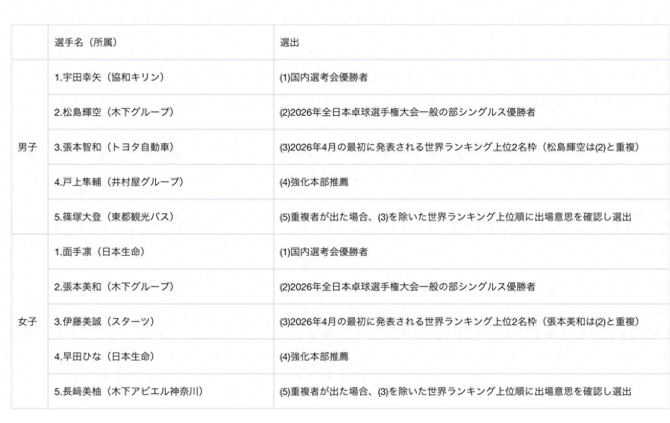 日乒公布了2026年亚运会的男女团体赛名单体,男队的团体赛阵容是:张本智和、松岛辉空、户上隼辅、宇田幸矢、篠塚大登。女子团体赛的阵容是:张本美和、早田希娜、伊藤美诚、长崎美柚、面手凛。只不过单打、双打、混双的名额要到5月份才会公布,大藤沙月刚刚在太原挑战赛夺冠,却无缘参加这次亚运会的比赛。