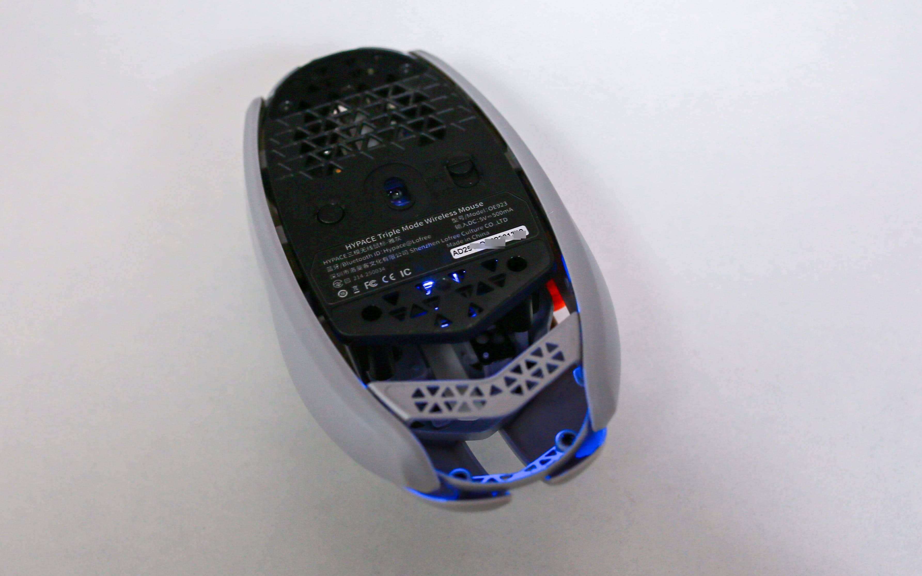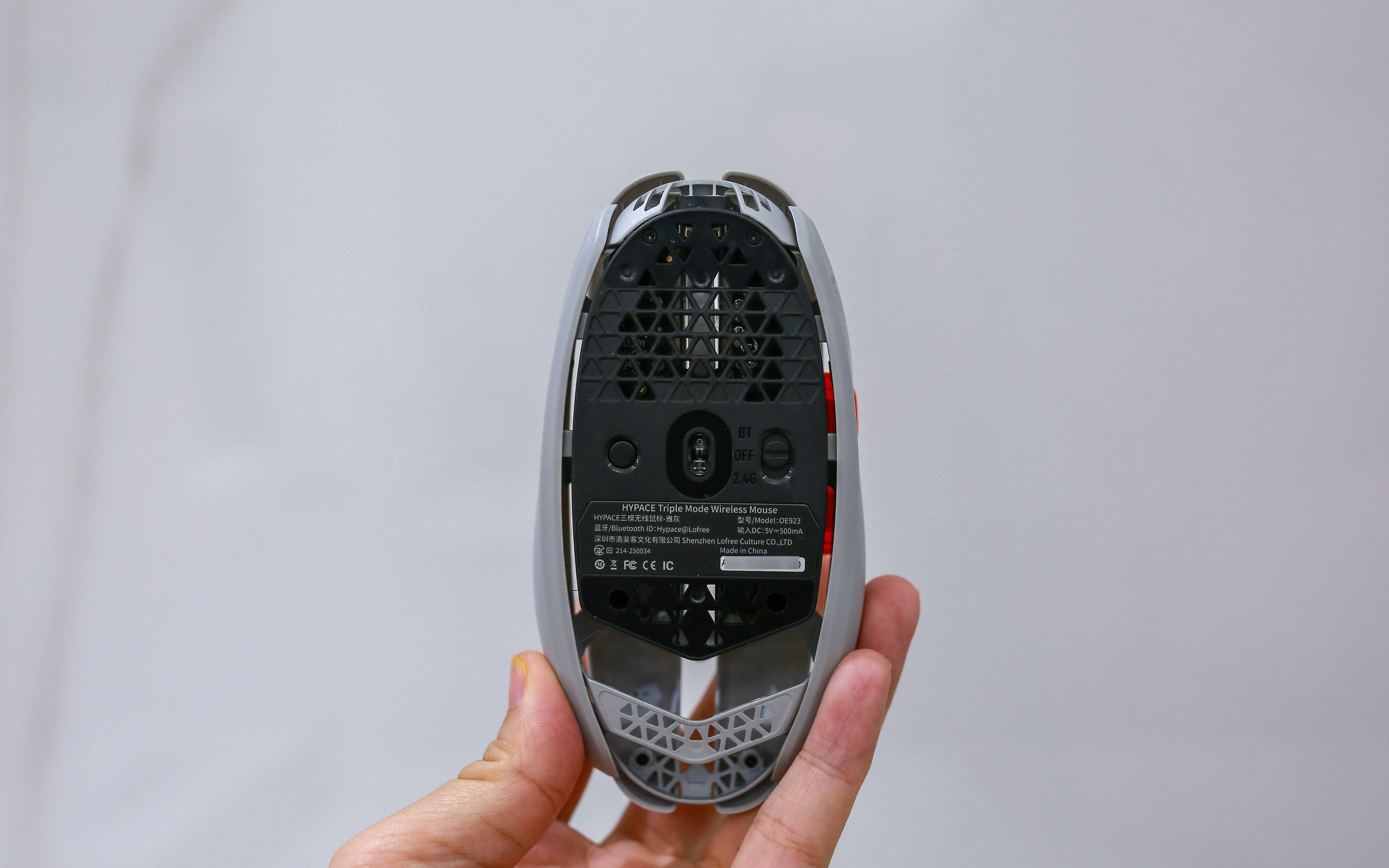 三种模式切换在鼠标底部后面,通过一个滑动开关完成,按下背面的 DPI 按键也方便调灵敏度。设计不破坏整体质感,很贴心。