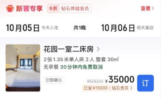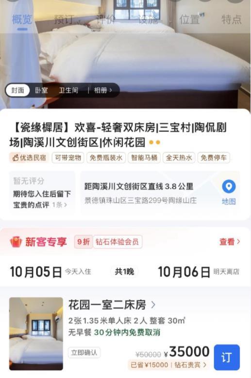 10月5日,记者在该APP上查询到这家名为瓷缘樨居的民宿,选择预订10月5日入住。页面显示,该民宿一间花园一室二床房,原价每晚50000元,会员优惠后价格为每晚35000元。该民宿其他房间国庆期间价格约1000元/晚,非节假日常规价格为365元至1188元/晚,涉事房型实际为普通双床房。(消息来自极目新闻)