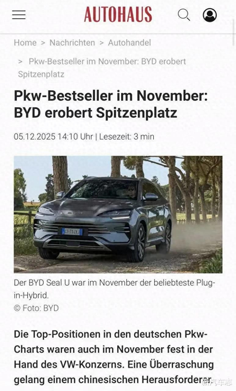 近日,BYD SEAL U(宋PLUS)成为德国11月车市插混车型销量冠军,引发行业广泛关注。这不仅是中国汽车品牌首次在德国主流细分市场登顶,更意味着比亚迪在欧洲的规模化突破已进入全新阶段。