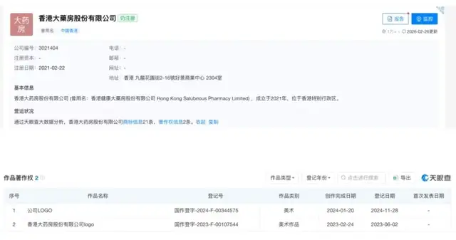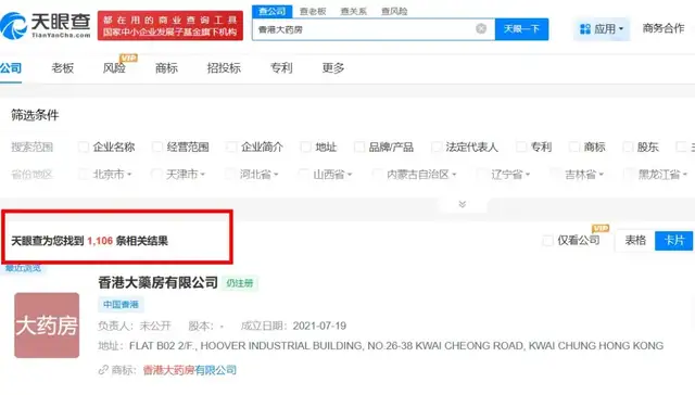 然而,天眼查显示:香港大药房有限公司成立于2021年7月,至今不到5年,该公司同时注册了“香港大药房股份有限公司”等商标,并授权给其他公司使用。一石激起千层浪,此事曝光后,多家媒体进行了跟踪报道,以名称中包含“香港大药房”在天眼查平台搜索,结果多达上千家。
