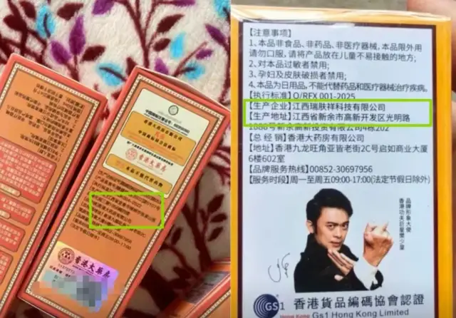 今年3月,有网友在“香港大药房有限公司官方旗舰店”下单了透骨膏,然而,拆开包装仔细一看,生产厂家竟然写着“江西瑞肤祥科技有限公司”——没错,不是香港,是江西。