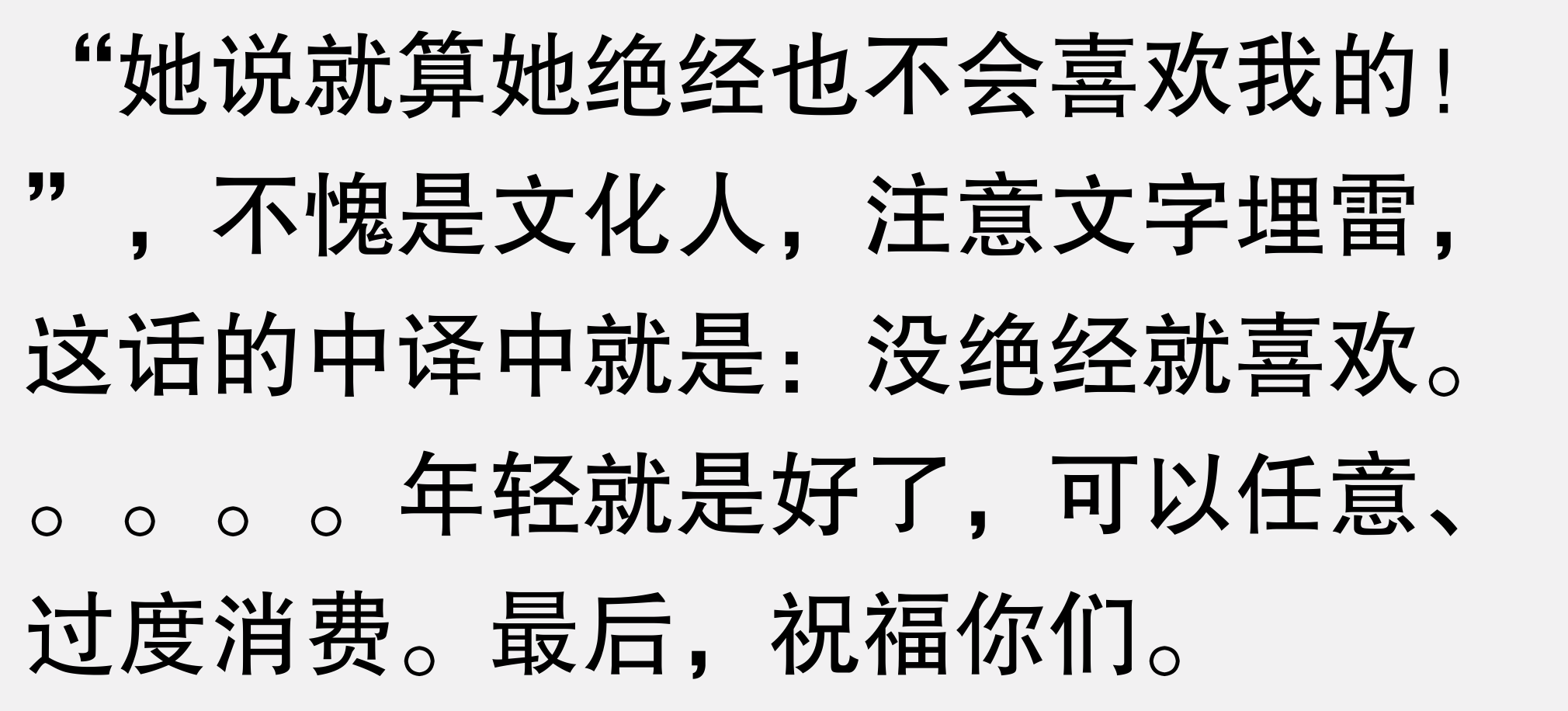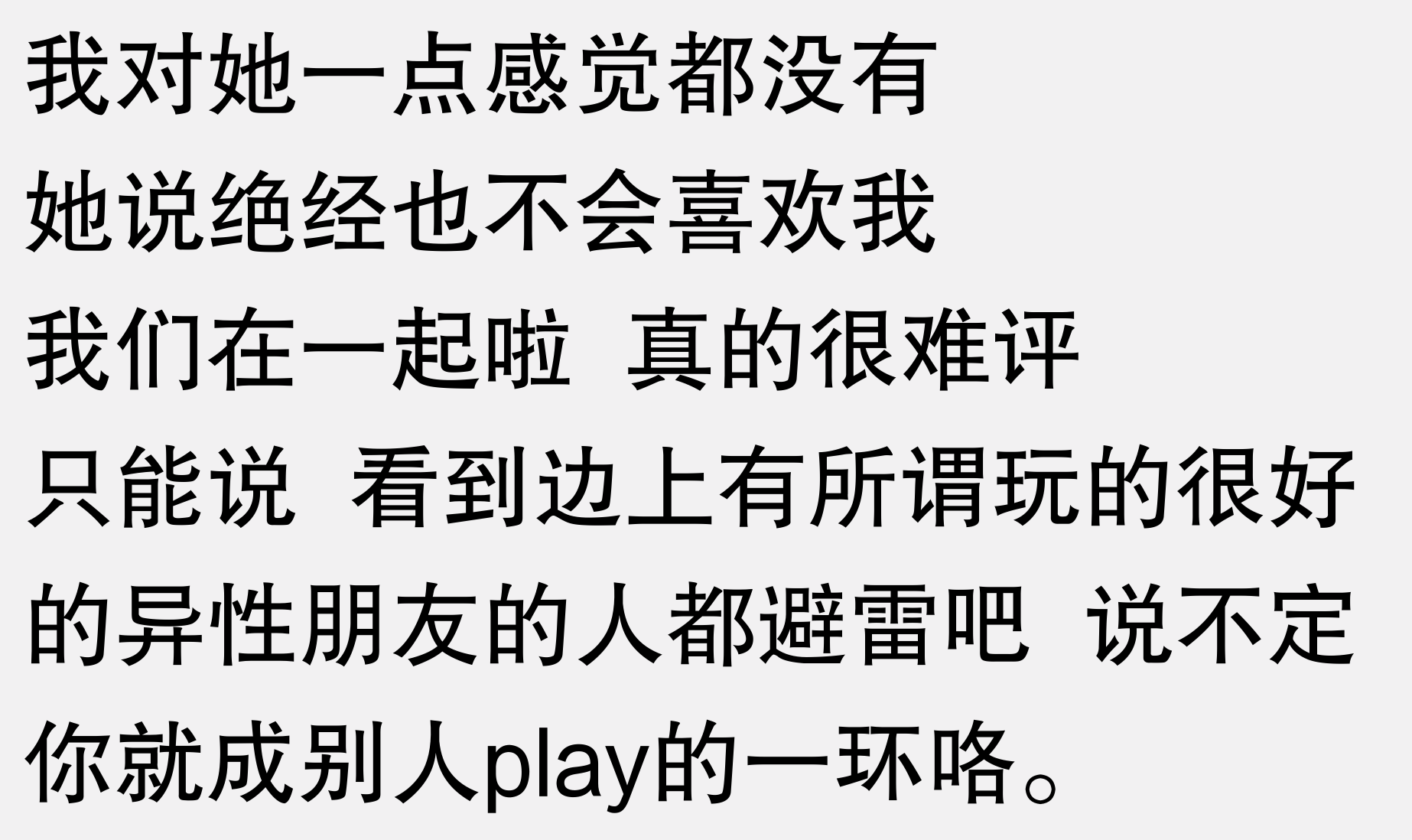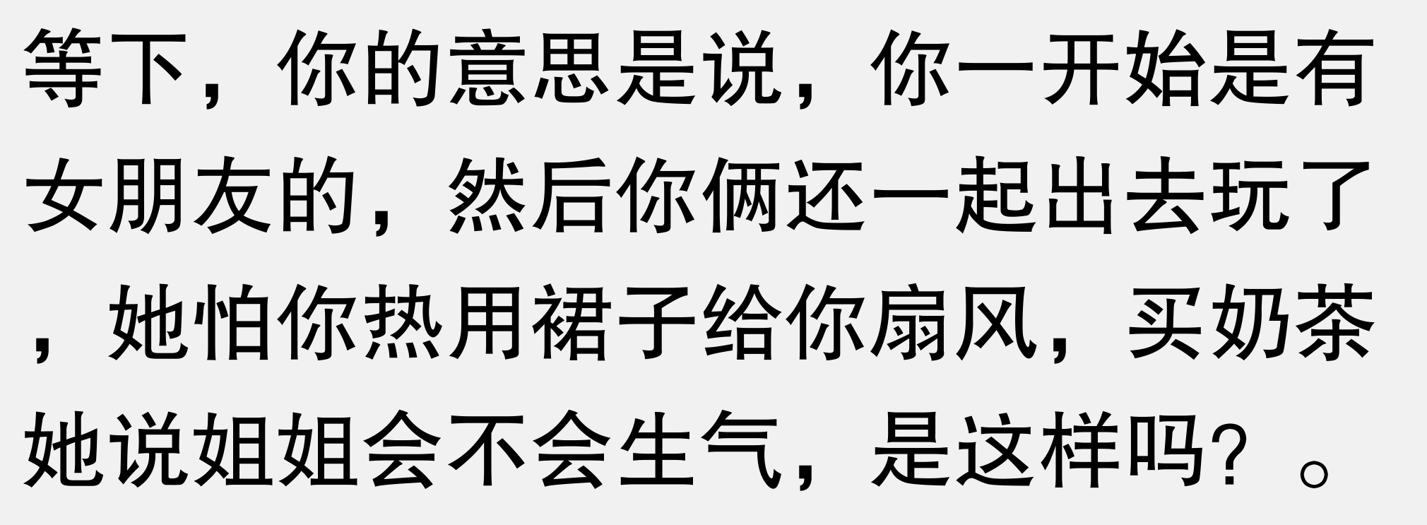 你是真不了解女人拿自己的裙子给你扇风,跟你开伦理梗的玩笑,这种情况下只要不是极其高端的绿茶婊,那就是真对你有意思。还有一个佐证:女人在不喜欢你的情况下,如果你们聊到暧昧的话题,她要么不接茬,要么装傻打马虎眼,绝对不会说“我这个性格肯定能撑起来”这种话。纯粹的男女友谊,其实根本就不会涉及到任何暧昧的成分