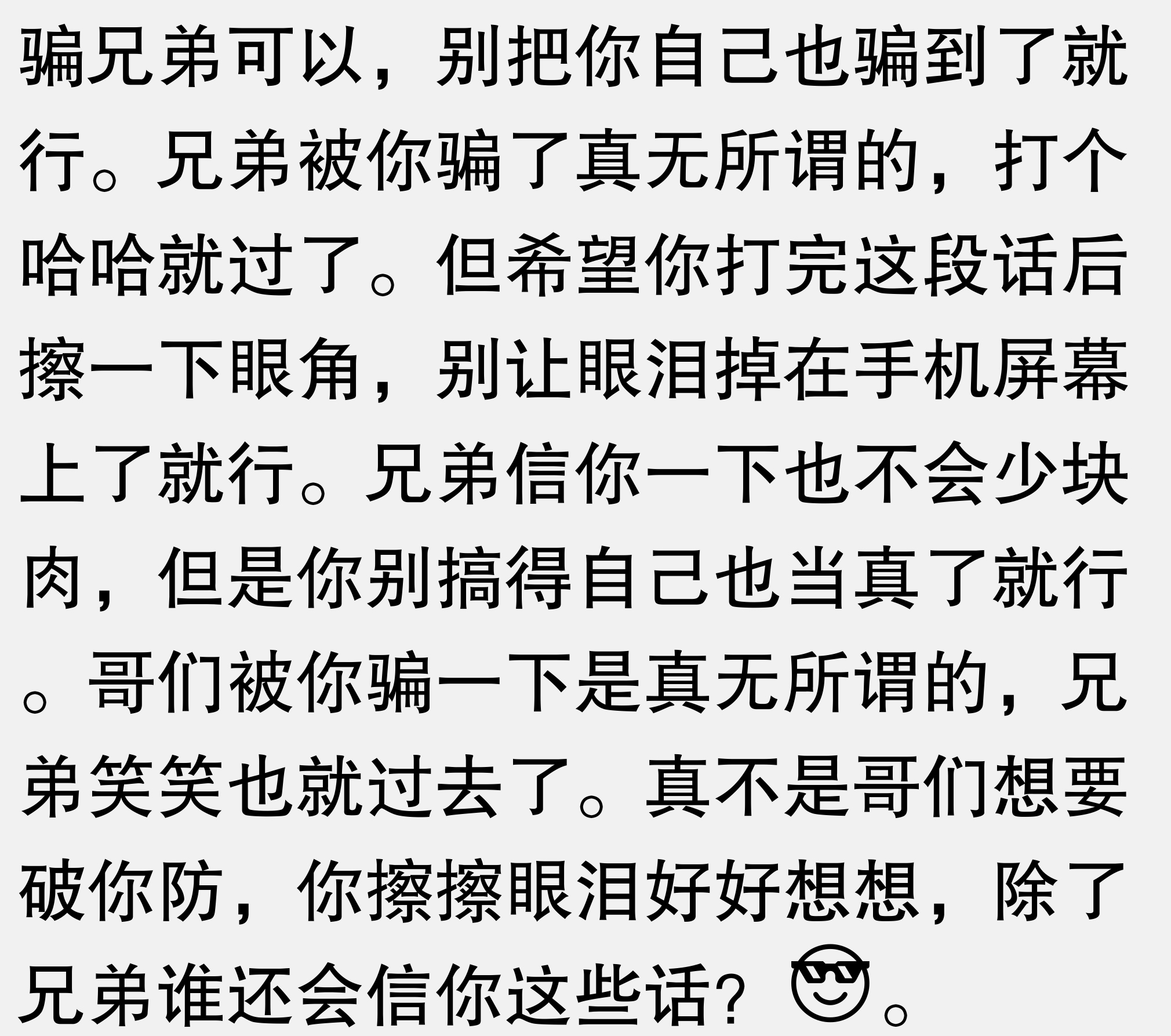 哥,我给你递根烟,求你别说了。我承认真的破防了,你说的这番话仿佛古代骑士的利剑叉进了我的胸膛,我躺在床上翻来覆去的睡不着 脑子里全是你对我说的这番话,我承认如果有机会我一定会跪下求你 求你收回你说的这番话,我不知道为什么文字在你嘴里怎么会这么有杀伤力,就像是躲过核弹爆炸的人一样,我在幽暗的地下室庆幸自己没有死,就像我现在躲在被窝里庆幸别人不知道你这样说我。