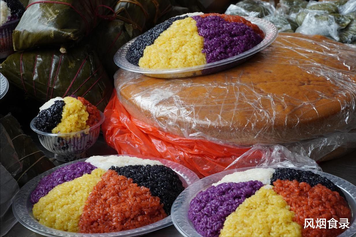 黑染枫叶汁,黄取黄姜浆,红用红蓝草,蓝取蝶豆花,白是糯米本色,五色对应五姓,这饭吃的是“五姓同根”的念想。