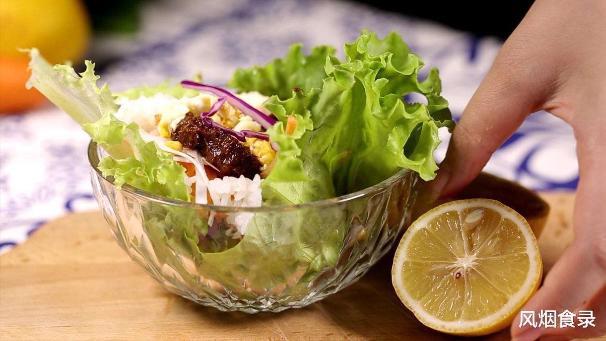 现炒现做,白米饭混着鱿鱼、虾米、腊肠、坡芹等十来种料,生菜叶一裹,咬下去米香、肉香、菜汁香在嘴里打转,软糯中带点脆,咸淡刚好。