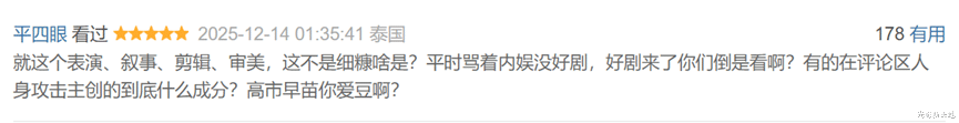 最后引用一条高赞评论“就这个表演、叙事、剪辑、审美,这不是细糠啥是?”《反人类暴行》绝对是精细打磨成的“细糠”,长期以来,我们习惯于追剧被动思考、被强化情绪输出的短视频和短剧牵动喜怒哀乐,能让人细品、主动思考且回味的好剧终于来了,且看且珍惜吧。