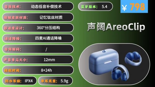先看戴起来舒不舒服,稳不稳定。单只耳机的重量,最好控制在5.3克以下。耳夹的材质,要优先选钛合金、记忆钢丝搭配软硅胶的。这样既能适合不同的耳朵形状,又能保证戴很久也不压耳朵,运动的时候也不会滑落。
