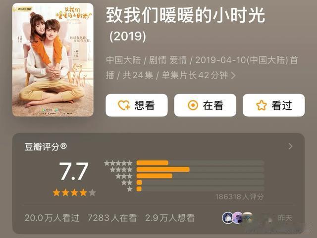 2019年4月10日开播的《致我们暖暖的小时光》,由邢菲、林一、唐晓天、郑英辰、周峻纬主演。该剧豆瓣中超过18万人给出了7.7分。