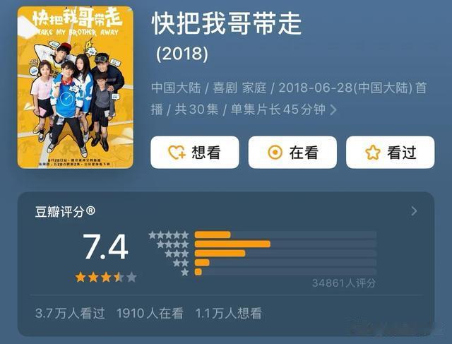 2018年8月17日开播的《快把我哥带走》,由曾舜晞、孙千、王旭东、胡永涛、马伯全主演。该剧豆瓣超过3万人给出了7.4分。