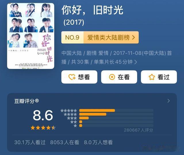 2017年11月8日开播的《你好,旧时光》,由李兰迪、张新成、周澄奥、李牵、许梦圆主演。该剧豆瓣上超过28万人打出了8.6的超高分!