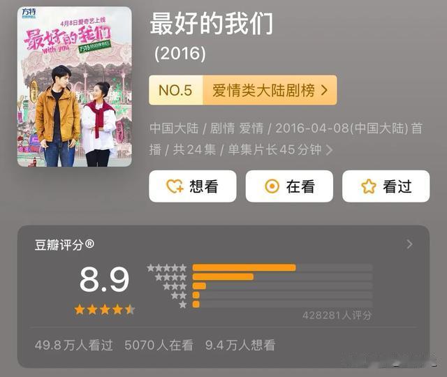 2016年4月8日开播的《最好的我们》,由刘昊然、谭松韵、王栎鑫、董晴、方文强主演。这部作品在豆瓣中,有超过42万人打出了8.9分的恐怖成绩!