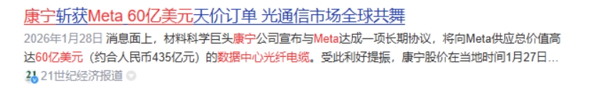 1月底,Meta与康宁签订60亿美元AI数据中心光缆大单,充分说明AI对光纤需求。