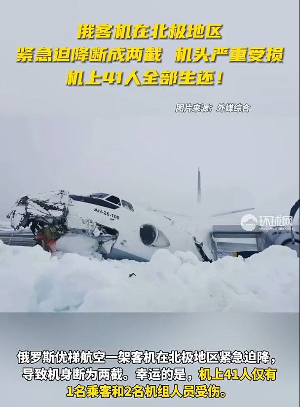 据环球网报道,一架俄罗斯优梯航空公司的客机在北极地区紧急迫降,机身断为两截,但幸运的是,机上41人中仅有1名乘客和2名机组人员受伤。这起事故发生在2024年6月14日,飞机从亚马尔半岛的萨贝塔起飞,计划飞往乌特连尼机场,在强风、浓雾和大雪的恶劣天气条件下,飞机从雷达屏幕上消失并最终硬着陆。