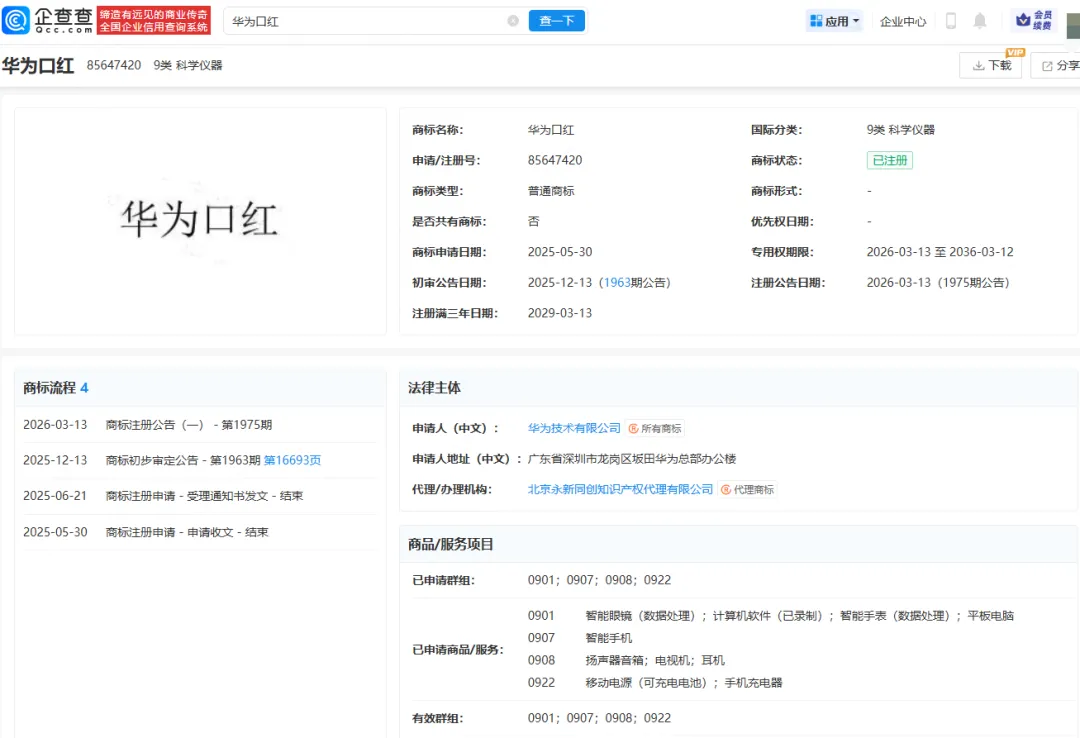 注册的“华为口红”商标,国际分类确实属于第9类“科学仪器”。这个分类涵盖的商品都是我们熟悉的华为产品线:智能眼镜(数据处理)、智能手表(数据处理)、平板电脑、智能手机等等。