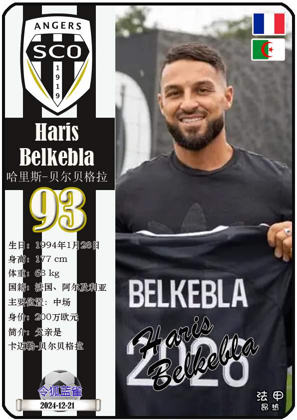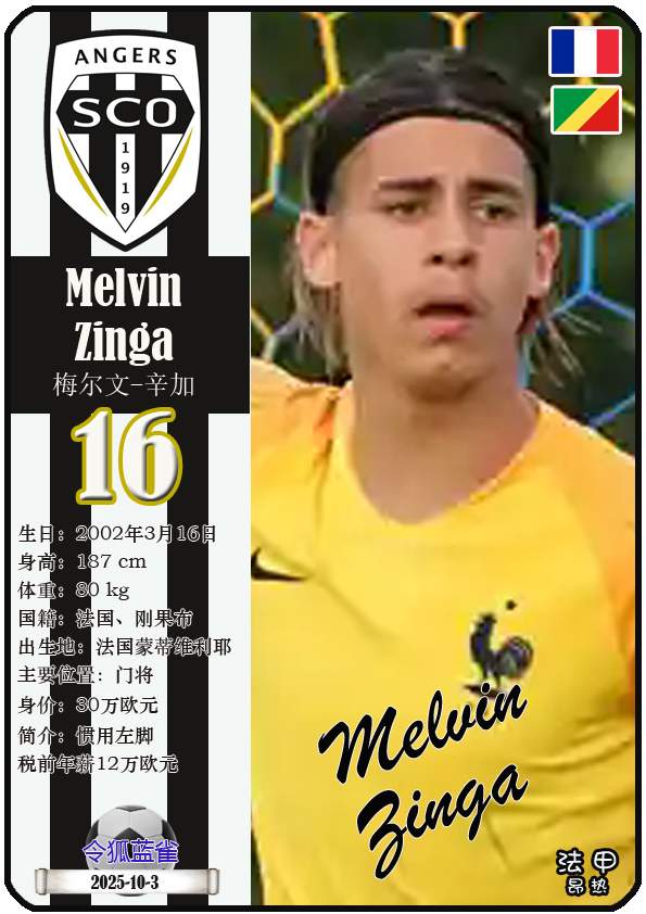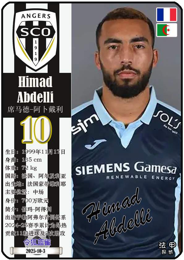 法甲昂热足球俱乐部成立于1919年10月19日,距今已有106年历史。截至2025年10月3日,球队主教练是亚历山大-杜热,队内拥有球员席马德-阿卜戴利、埃尔韦-科菲、皮埃里克-卡佩勒等。本期以球星卡的形式展示目前法甲昂热足球俱乐部的7名球员(按球衣号码排序):