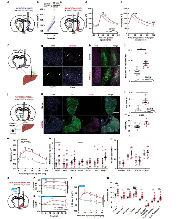 环路解剖:MeA Vglut2+神经元投射VMH,再经交感神经直抵肝脏