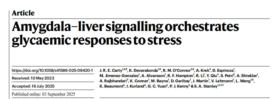 Carty JRE, Devarakonda K, O'Connor RM, et al. Amygdala-liver signalling orchestrates glycaemic responses to stress. Nature. 2025 Sep 3. DOI: 10.1038/s41586-025-09420-1.