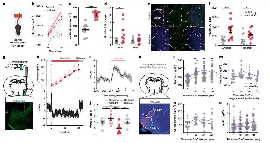 30分钟束缚→MeA神经元放电→肝糖输出增40%,重复应激让环路“熄火”血糖居高不下急性应激激活MeA^VMH神经元调控血糖