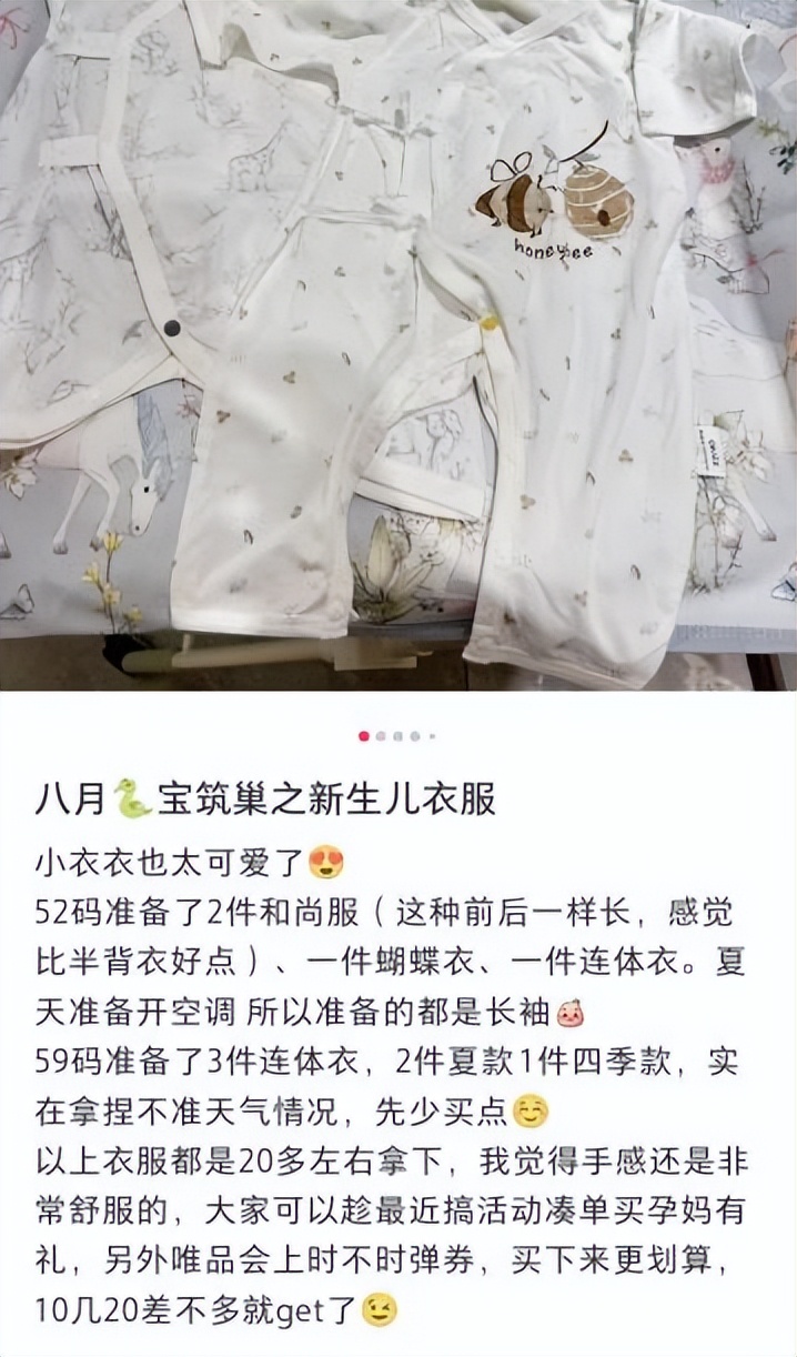 后面上网查了一下,很多宝妈也是想芳姐一样的想法。例如有准宝妈在唯品会囤货表示“趁着现在搞活动,先把八月份蛇宝宝的衣服屯好,每件只要20几就能拿下,性价比很高。”