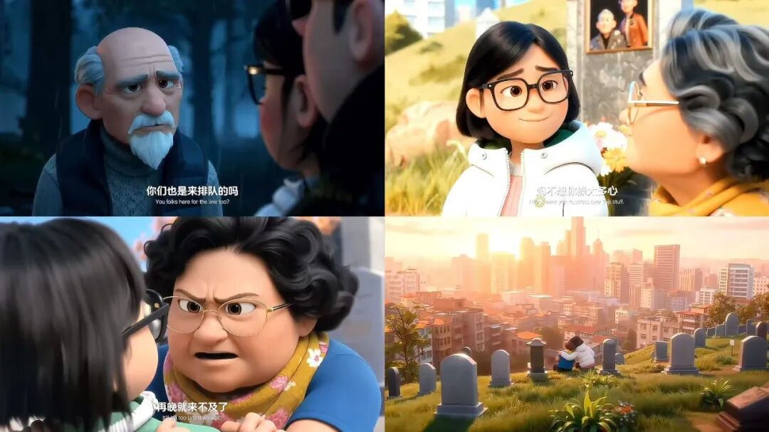 相反,作为碳基生物的人类,大部分时间其实都不是为了效率活着,总是磕磕绊绊,也离不开亲情、爱情和友情的依赖,这就是所谓的贪嗔痴,人类的缺陷。事实上,在浩如烟海的AI视频里,真的能打动人往往就是有这种缺陷叙事的作品。比如去年11月即梦制作的《老妈的心愿》,讲的也是一个替老妈争公墓位置的故事,它的画风挺卡通,涉及到的场景也不如其他视频炫技,但是看过的人很难不被触动。在东亚社会里,女儿和妈妈总是有点互相不对付的,尤其是妈妈为了争公墓,让女儿半夜四点去排队甚至因此摔断了腿。这种执念堪称人类缺陷典中典。但也是因为如此,女儿在一个偶然的瞬间发现,自己的妈妈也是外公外婆的女儿,她不是生来就是妈妈,所谓的执念不过是人之常情。