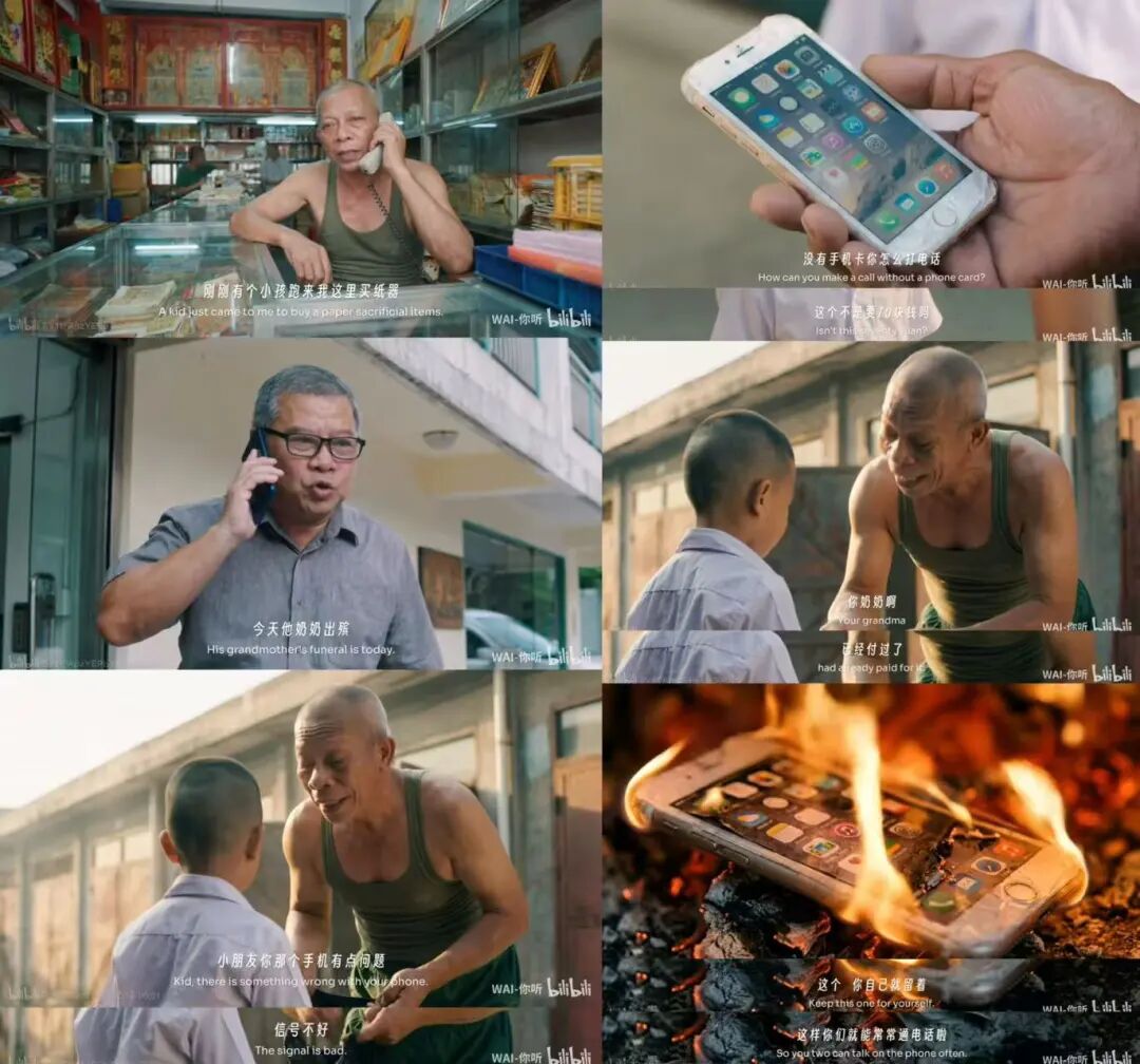 故事其实挺简单的:小男孩攒了15块钱去冥品店买手机,老板以为他胡闹给他画了一个纸手机打发他走了,结果后面才知道是小男孩唯一的亲人奶奶去世了,他是给奶奶买祭品。知道缘由的老板拎着一大袋祭品出来送给小男孩,跟他说纸手机“信号不好”,又善意地欺骗他说“奶奶付过钱了”,替他圆了孝心。