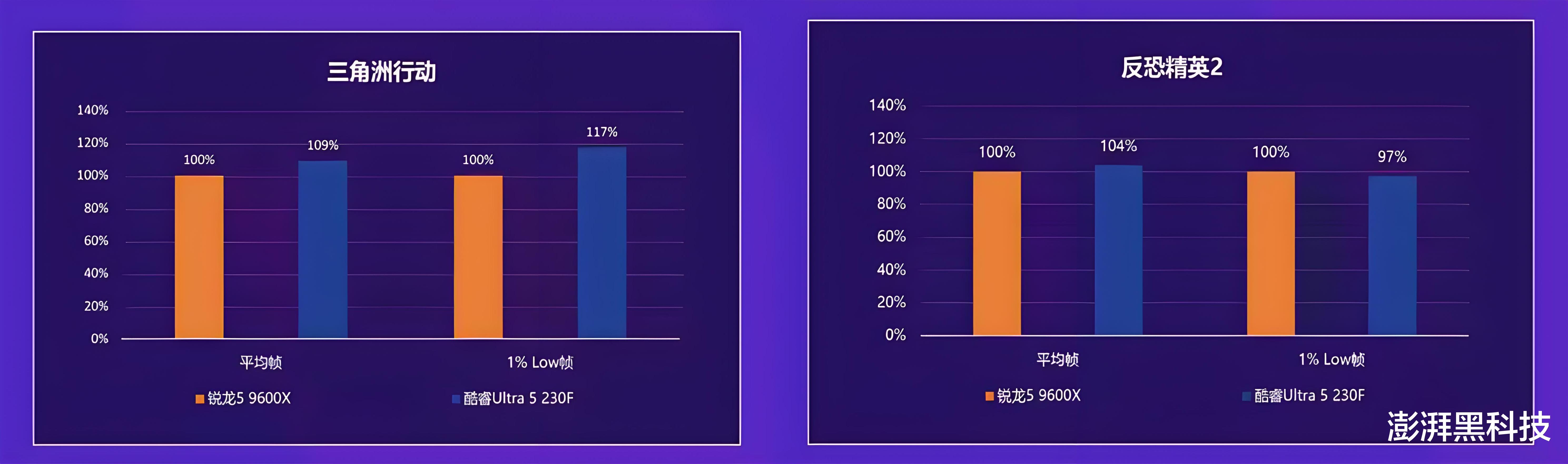 再说游戏性能,两者在大部分游戏里其实拉不开太大差距,但在一些特别吃单核和缓存的游戏里,比如《三角洲行动》或者《CS2》,Ultra U5系列的平均帧更高,玩起来更爽,比9600X稳不少。实测1080p高画质下,U5 230F在CS2的平均帧能高15%左右,竞技时枪枪到位的感觉,懂的都懂。而9600X虽在部分单机有小优,但受限于内存兼容性,实际体验波动大,万一买到不兼容的条,游戏卡顿能烦死人。