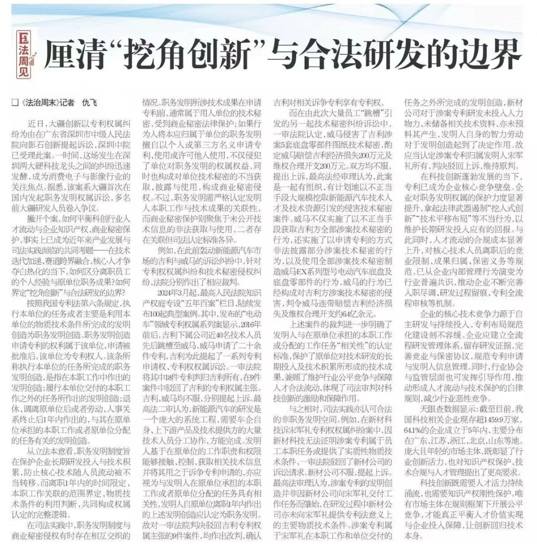 “在科技创新蓬勃发展的当下,专利已成为企业核心竞争力壁垒。企业对职务发明权属的保护力度显著提升,拿起法律武器遏制'挖人式创新'、'技术平移布局'等不当行为……已从企业内部管理行为演变为行业普遍共识。”