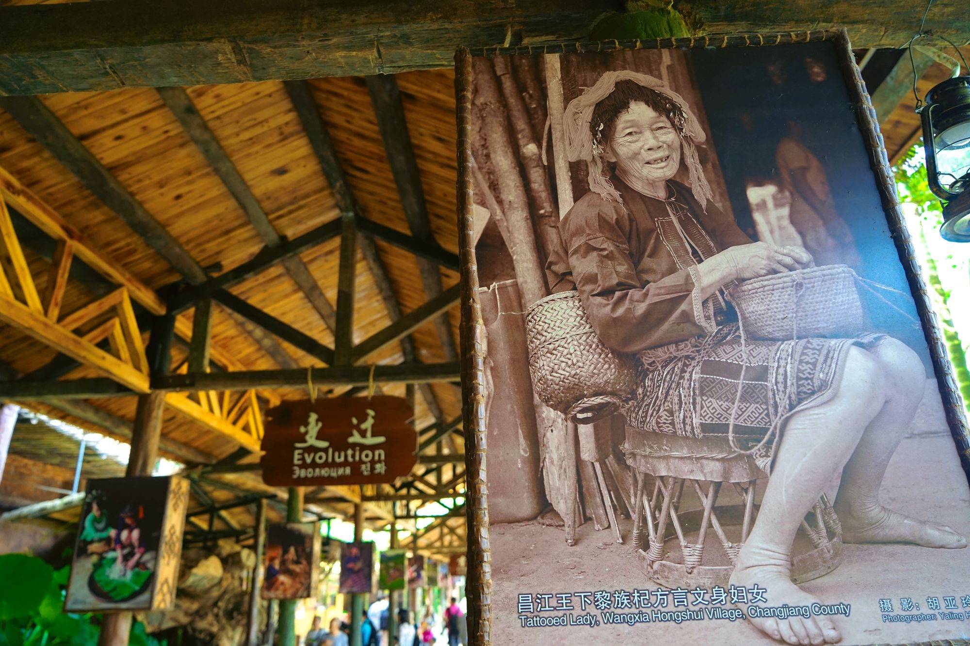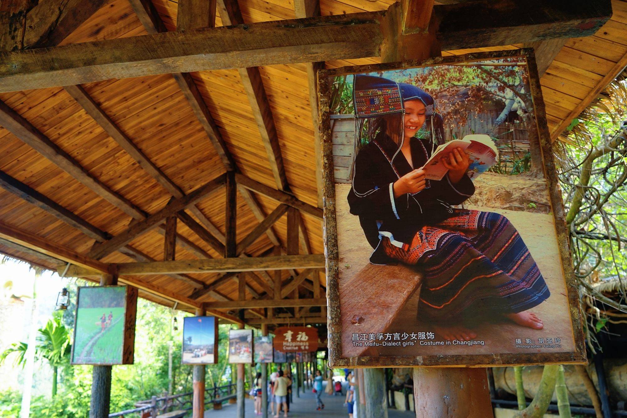 黎族传统村落中,一张张巨幅照片讲述着黎族的起源、变迁和发展历程,人们日常所穿的服饰、所用的物品,所住的房屋在这里都可以亲眼见到甚至亲手触摸、亲自体验。