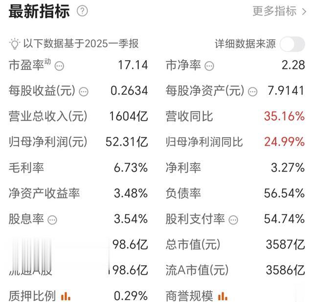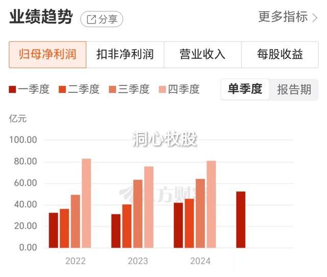 今年一季度,实现营业总收入1604.15亿元,同比增长35.16%;归母净利润52.31亿元,同比增长24.99%。