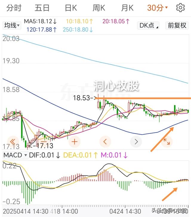 30分钟图中,k线在120均线上方盘整,MACD钝化。