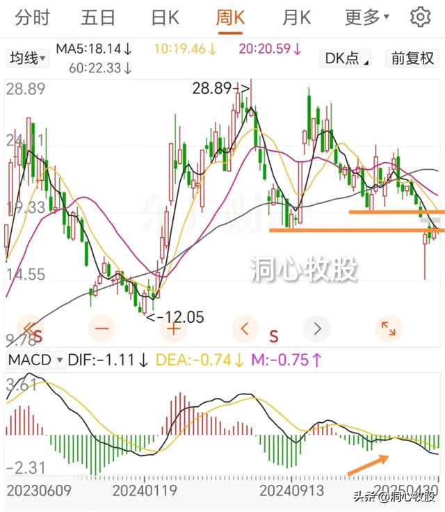 周k线图中,k线超跌反弹,下跌过前低,MACD死叉向下。