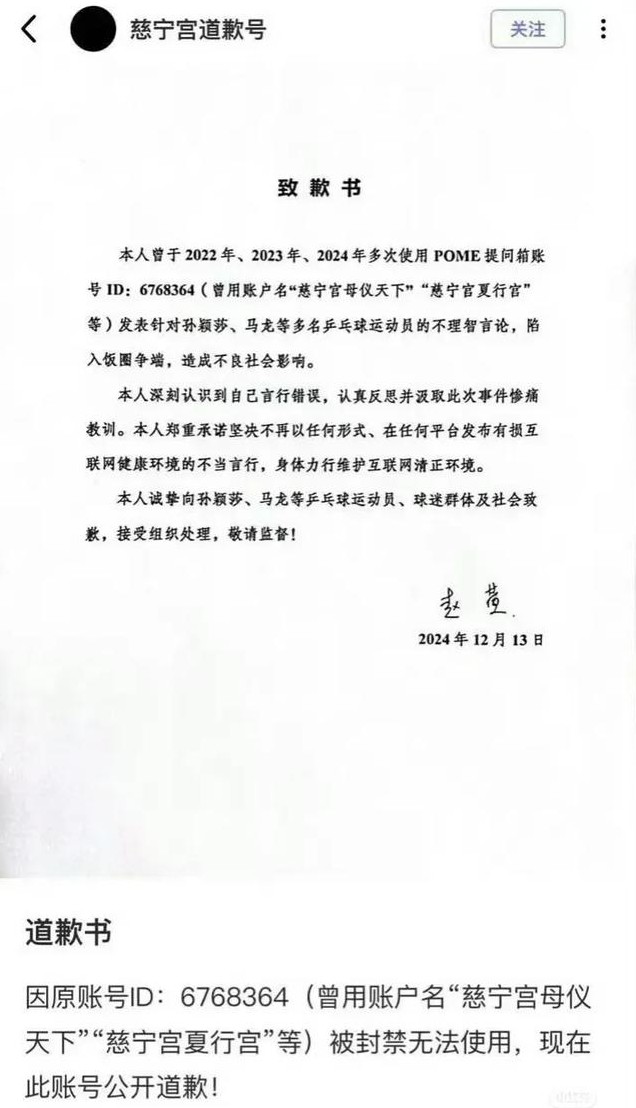 还记得前段时间,有一位樊振东的粉丝公开致歉的事情吗,一名叫赵萱的高校女教师在《道歉书》中表示曾多次辱骂马龙、孙颖莎等运动员。