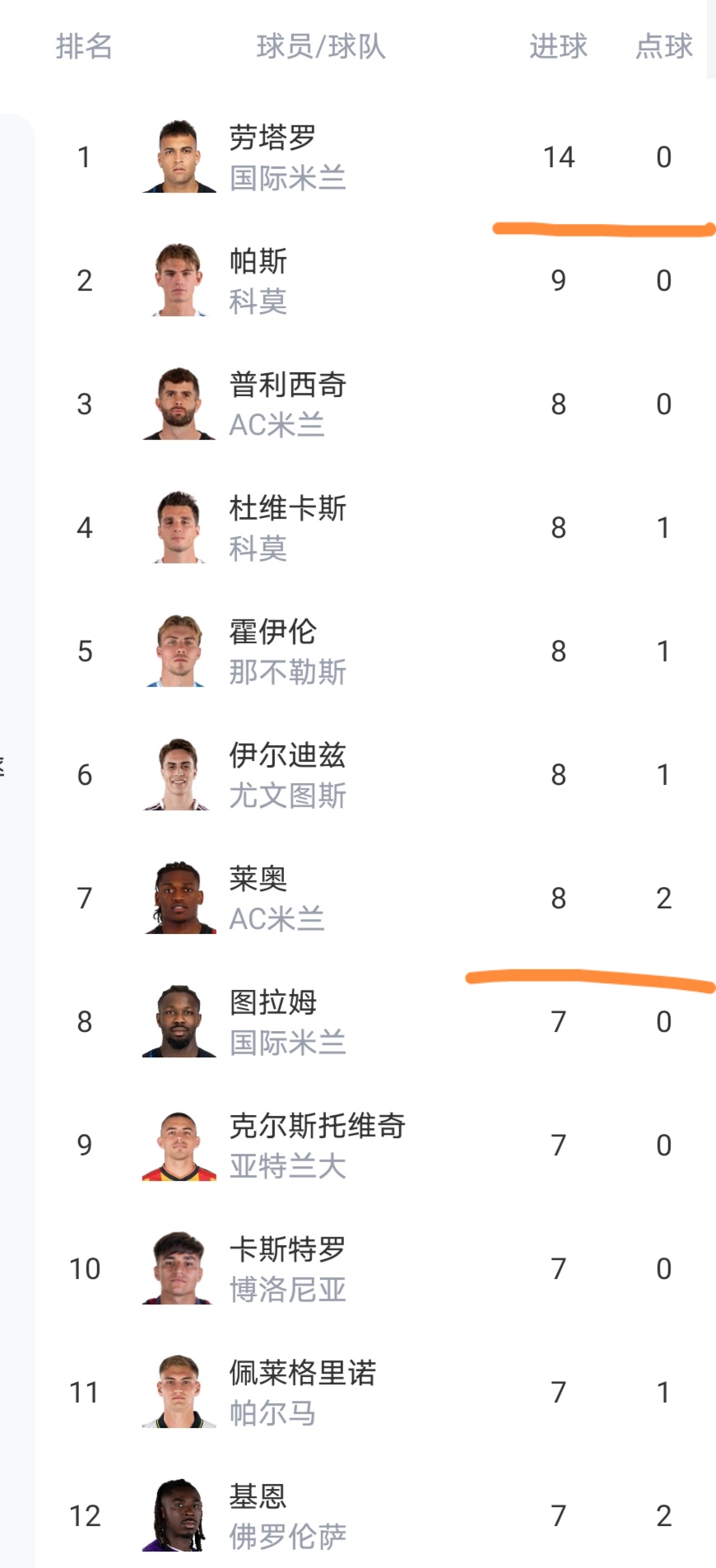 射手榜方面依然仅一人进球上双。