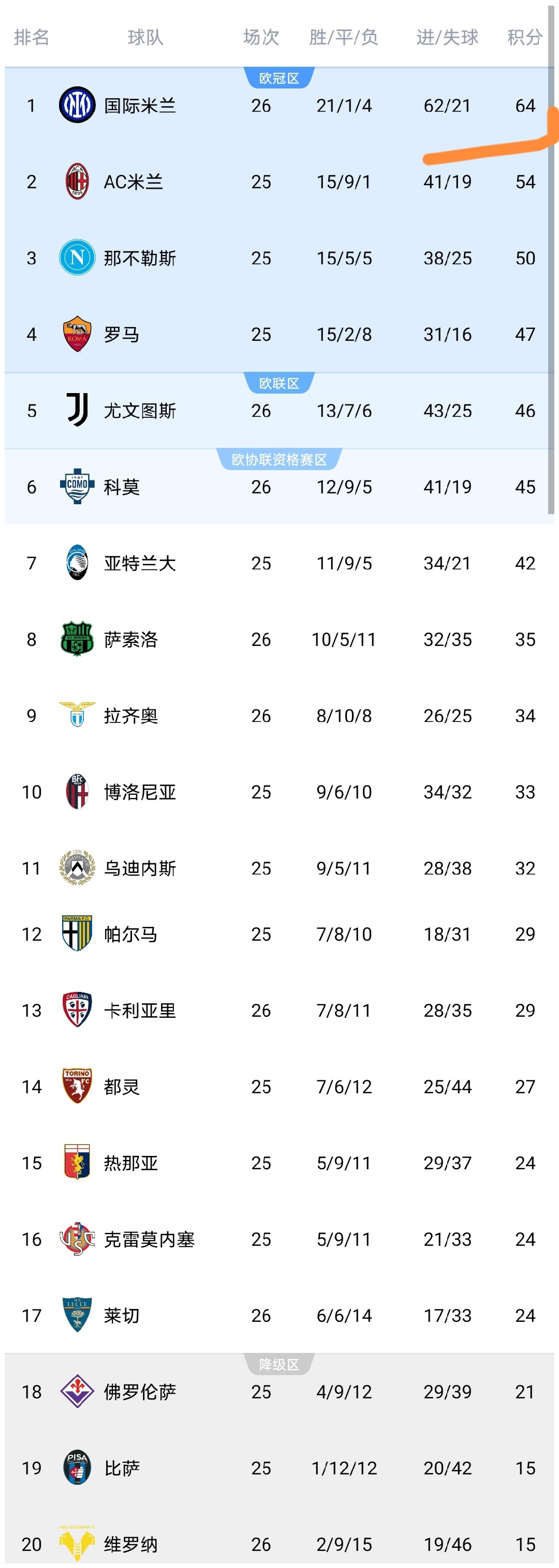 今天凌晨,意甲第26轮结束了3场较量,尤文图斯、国际米兰、拉齐奥等队出战,这三场较量之后,意甲积分榜发生变化,我们来看看。