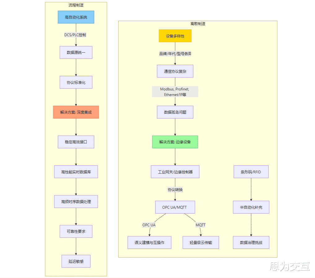 基于不同的管理目标,离散制造与流程制造在数据采集的技术栈选择和系统架构设计上,呈现出鲜明的对比。