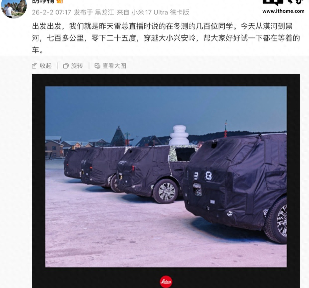2 月 2 日消息,今天早间,顺为资本投资合伙人胡峥楠在微博发文预热:今天从漠河到黑河,七百多公里,零下二十五度,穿越大小兴安岭,帮大家好好试一下“都在等着的车”。