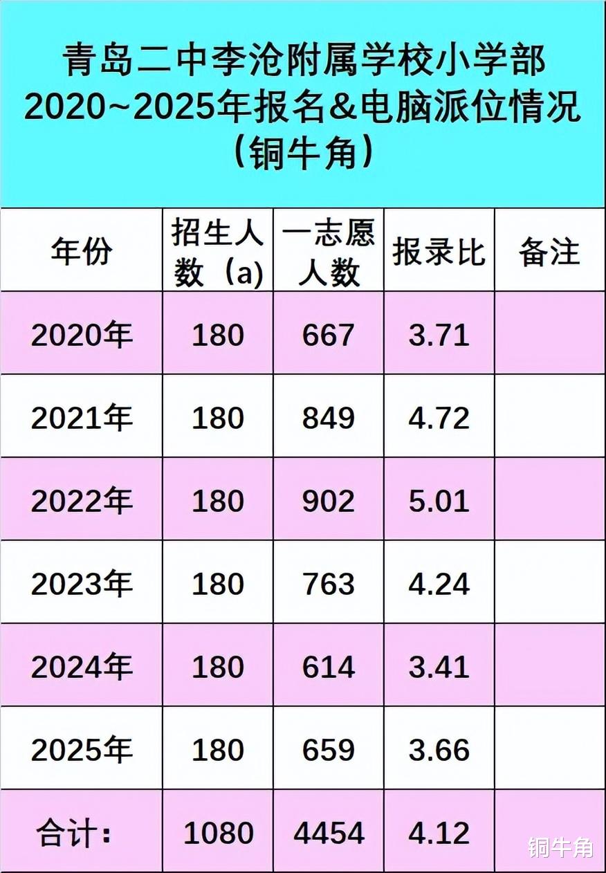 ⑤2024年青岛二中附属李沧学校小学部招生计划为4个班,180人,实际报名人数为614人,报录比为3.41:1。