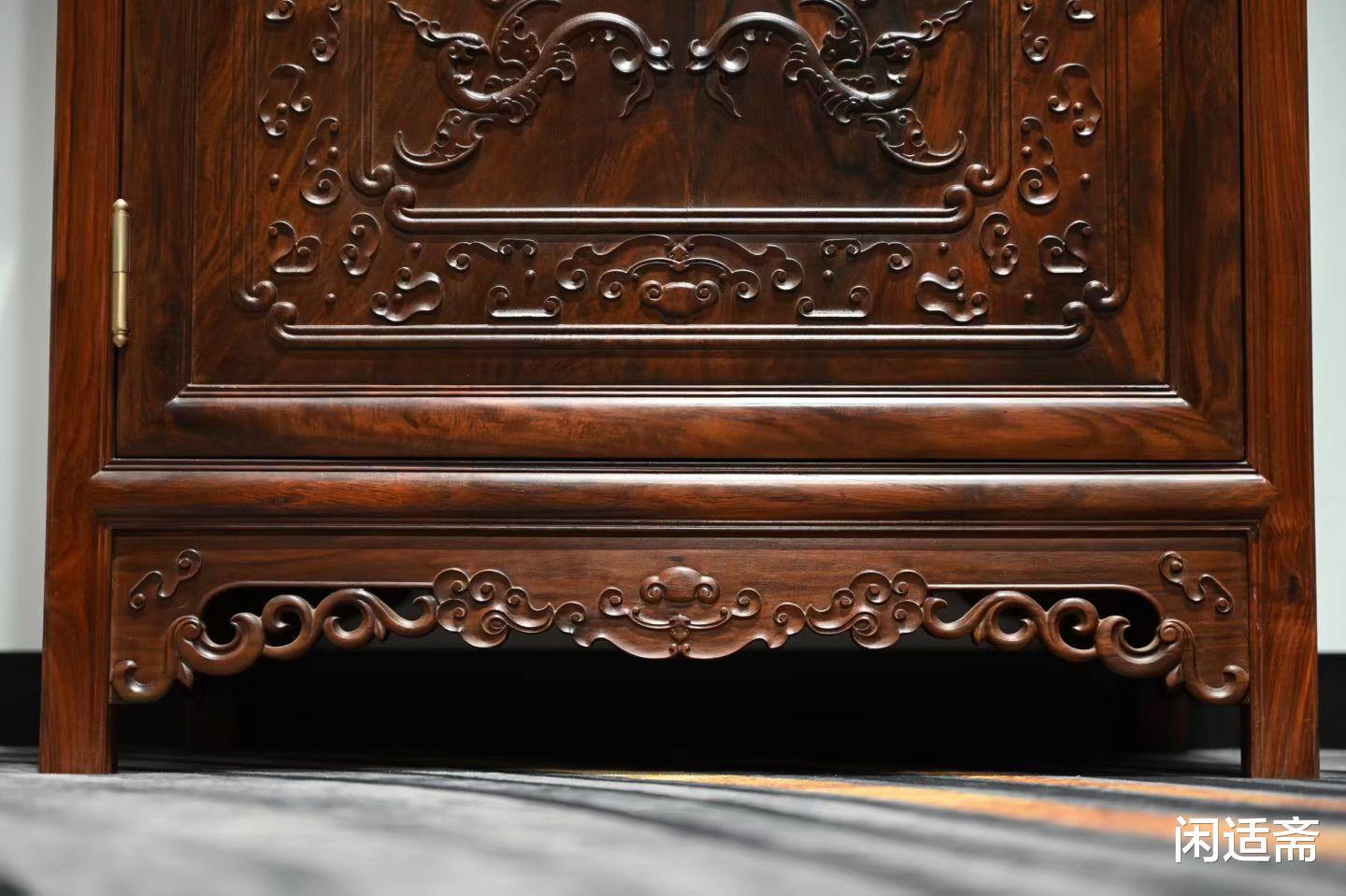 书架的底部设对开柜门,闭合严丝合缝,密封性佳,可用于收纳闲置古玩、书籍、杂物等,兼顾实用性与整洁度。柜门表面采用铲地浮雕工艺,雕琢对称螭凤纹,螭凤姿态优雅、栩栩如生,线条流畅连贯,对称分布的纹样尽显端庄大气,螭凤作为传统吉祥纹样,寓意着吉祥美满、富贵安康,既彰显了中式传统文化的底蕴,又让简约的柜门更具观赏性,与云纹遥相呼应,浑然一体。