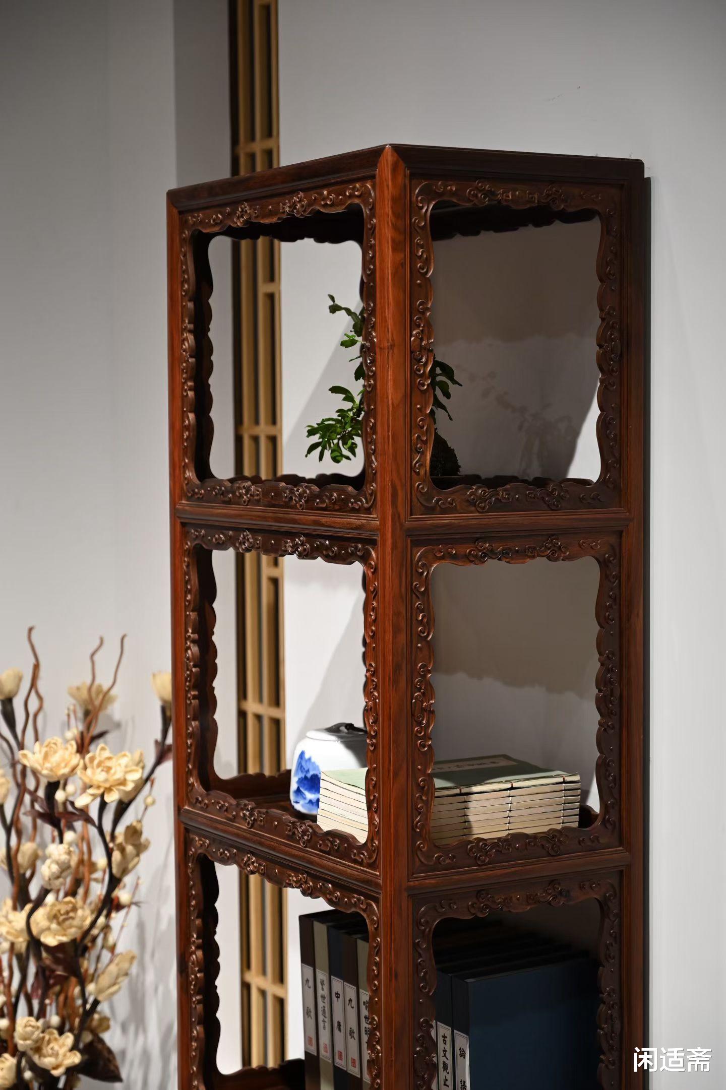 书架亮格分层规整,层高适中,可灵活陈列书籍、古玩、古籍、瓷器、摆件等,实现“藏”与“展”的完美平衡,满足主人的收藏与陈设需求。亮格边缘设铲地浮雕祥云纹圈口,云纹婉转流畅、舒展自如,线条细腻圆润,每一朵云纹都栩栩如生,既起到装饰点缀的作用,又增强了亮格的层次感与立体感,祥云纹寓意吉祥如意、云气升腾,为书架增添了雅致的文化意蕴。